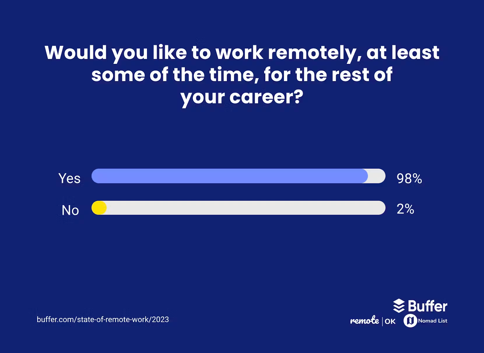 In addition, remote workers are more likely to be happy with their jobs and less likely to leave for a better opportunity. A study by Buffer found that 98% of remote workers want to work remotely for the rest of their careers and 98% would also recommend remote work to others.