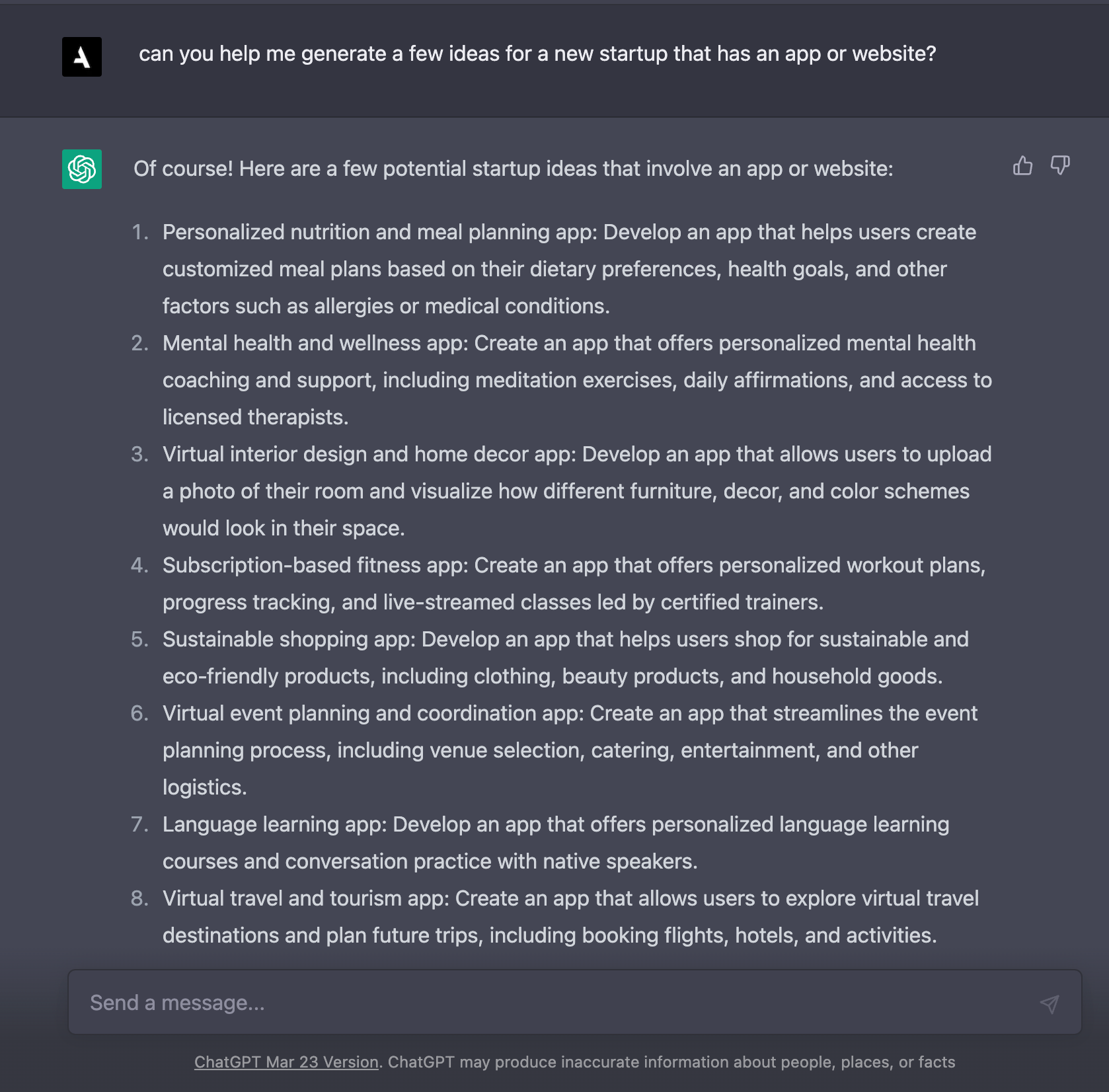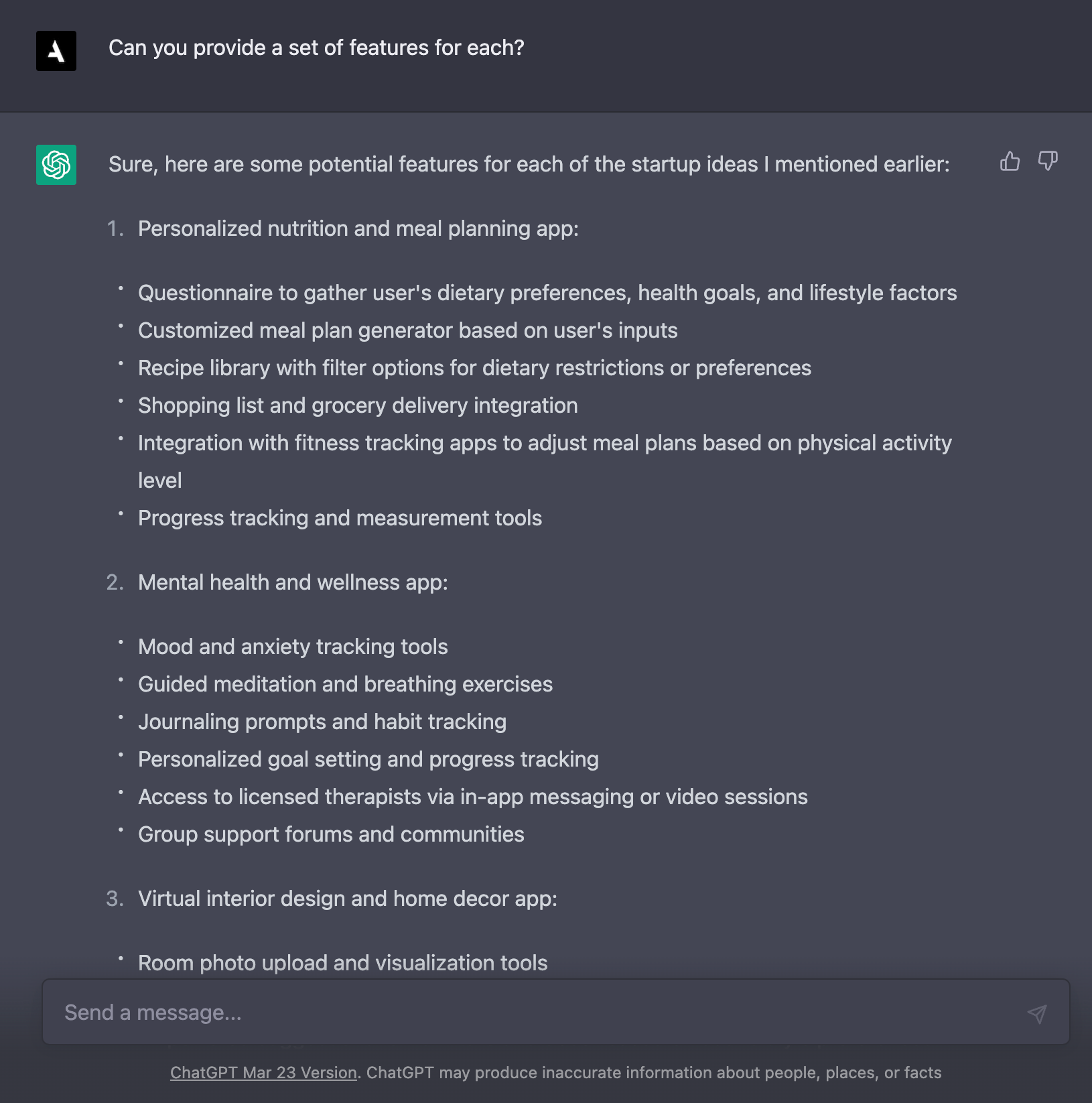 - Personal projects: When working on personal design projects, ChatGPT can help you generate ideas for new startup concepts or features. ChatGPT can also provide insights into market trends and user preferences that can help you create a product that is both innovative and in-demand. For example, if you're designing a mobile app for fitness enthusiasts, ChatGPT can suggest features such as workout tracking, personalized nutrition plans, or social sharing capabilities.