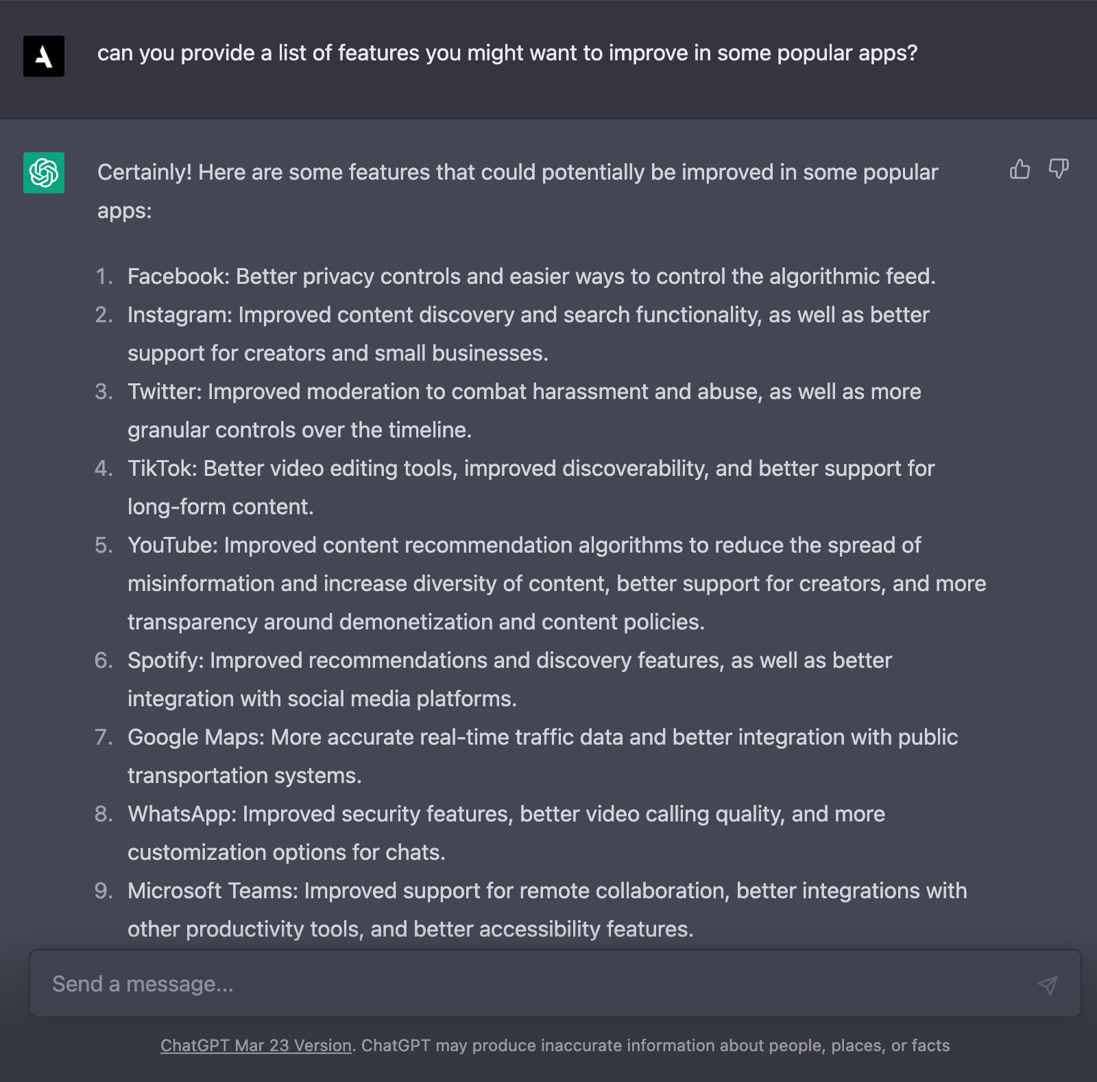 Can you provide a list of features you might want to improve in some popular apps?
