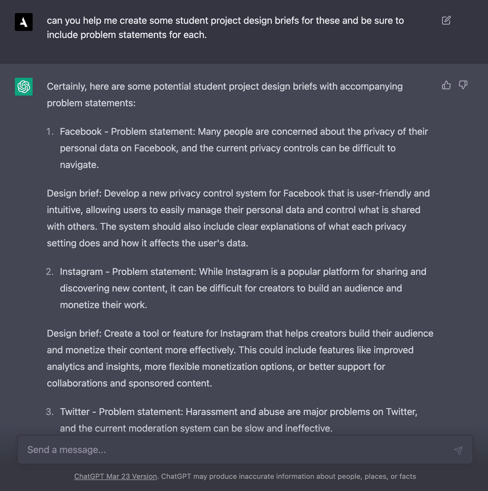 - Student projects: When working on a student project, you may be tasked with solving a real problem for a company. ChatGPT can help you generate ideas and insights based on the specific industry or market that the company operates in. For example, if you're designing a mobile app for a restaurant, ChatGPT can suggest features such as online ordering or loyalty programs that may be relevant to the industry.